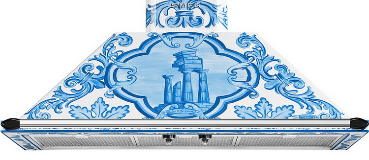 Настенная вытяжка Smeg KT90DGM из серии Divina Cucina была создана при коллаборации Smeg & Dolce&Gabbana. Модель выполнена в нежных бело-голубых тонах. Три скорости работы расширяют возможности использования вытяжки. Интенсивный режим способен устранить все неприятные запахи и дым за короткий промежуток времени. Освещение рабочего места осуществляется двумя LED-лампами, которые гарантируют комфорт в работе. Прибор функционирует в режиме отвода воздуха, что гарантирует более качественное очищение и высокую производительность.