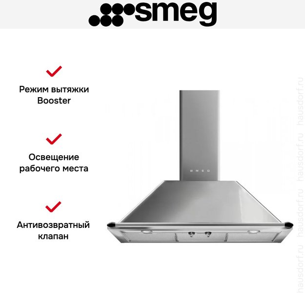 Модель серии Victoria от Smeg в неповторимом исполнении. Поворотные переключатели прибора плавно регулируют режимы работы, а яркое светодиодное освещение исключает необходимость дополнительной подсветки. Алюминиевый жироулавливающий фильтр долговечен и не требует замены.