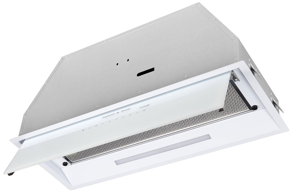 Вытяжки, встраиваемые в столешницу — эффективная инновация, которая подойдет для установки в кухне любой площади. Такие вытяжки размещаются за варочной поверхностью или рядом с ней. В отключенном состоянии всасывающая панель находится под столешницей, но после включения одной или нескольких конфорок она автоматически выдвигается при помощи специального лифтового механизма. Загрязненный воздух улавливается, не успевая распространиться по помещению. Когда вытяжка убрана, на виду остается только сенсорная панель управления. Недостатком подобных моделей является только сравнительно высокая цена.