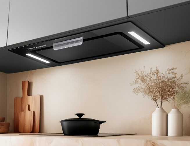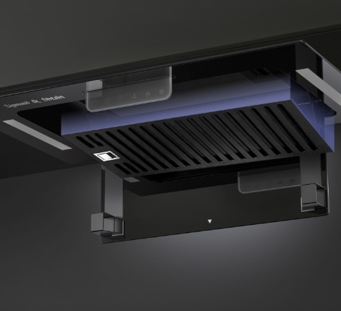 Вытяжки, встраиваемые в столешницу — эффективная инновация, которая подойдет для установки в кухне любой площади. Такие вытяжки размещаются за варочной поверхностью или рядом с ней. В отключенном состоянии всасывающая панель находится под столешницей, но после включения одной или нескольких конфорок она автоматически выдвигается при помощи специального лифтового механизма. Загрязненный воздух улавливается, не успевая распространиться по помещению. Когда вытяжка убрана, на виду остается только сенсорная панель управления. Недостатком подобных моделей является только сравнительно высокая цена.