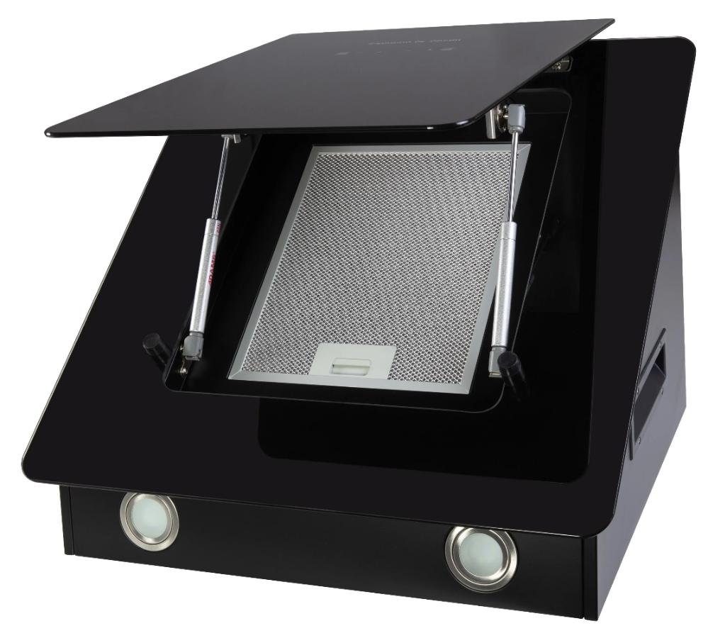 Вытяжки с наклонной фронтальной панелью позволяют освободить пространство над варочной панелью, при этом мощность забора воздуха не страдает от конфигурации модели. Такими вытяжками удобно управлять, так как кнопки обычно находятся спереди, доступ к ним максимально облегчен. Зачастую есть всасывание по периметру.