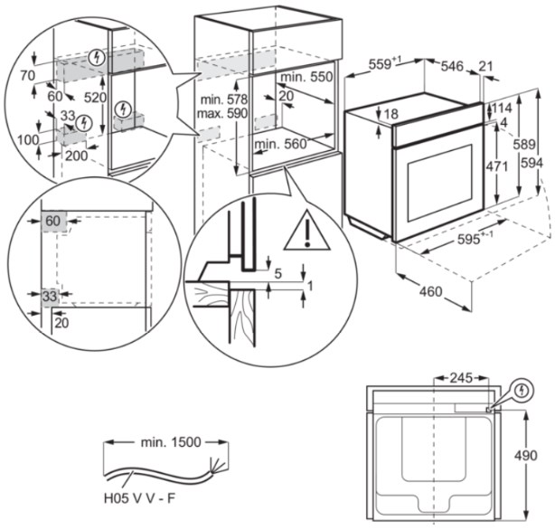 Electrolux OKD 5C51 Z - схема встраивания с размерами к духовому шкафу на разных языках на Hausdorf