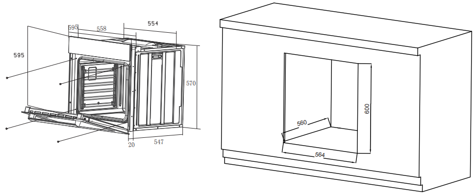 Haier HOX-P06HGBX - схема встраивания с размерами (1) к духовому шкафу на разных языках на Hausdorf
