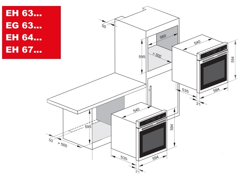 Kaiser EH 6432 BE ECO - схема встраивания с размерами к духовому шкафу на разных языках на Hausdorf
