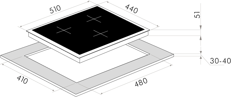 Maunfeld EGHG.43.33CB.R/G - схема встраивания с размерами к варочной панели на разных языках на Hausdorf