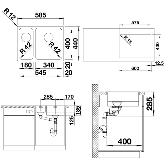 Blanco SOLIS 340/180-IF 526131 - схема с размерами к мойке на разных языках на Hausdorf