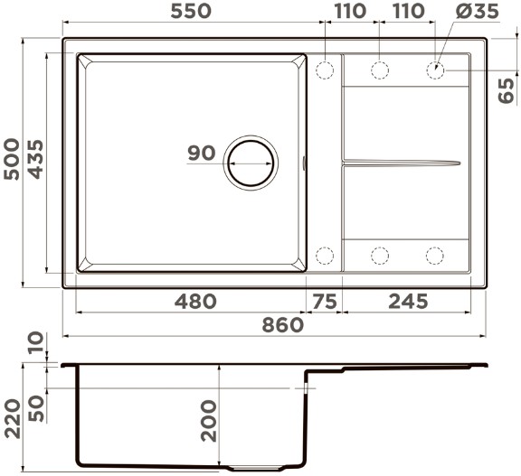 Сохранить файл: Схема с размерами к Omoikiri SUMI 86A WH.JPG, 45 Кб