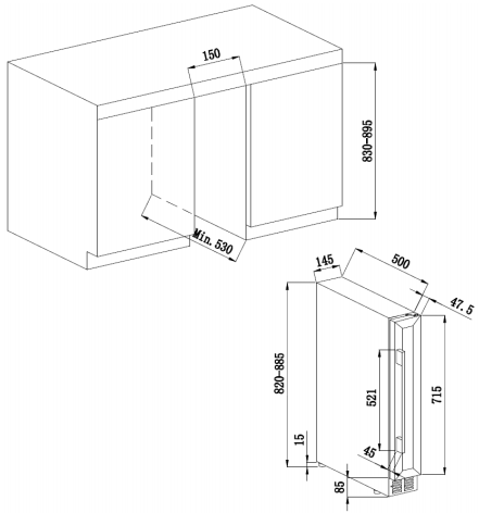 Climadiff AVU8XA - схема встраивания с размерами к винному шкафу на разных языках на Hausdorf