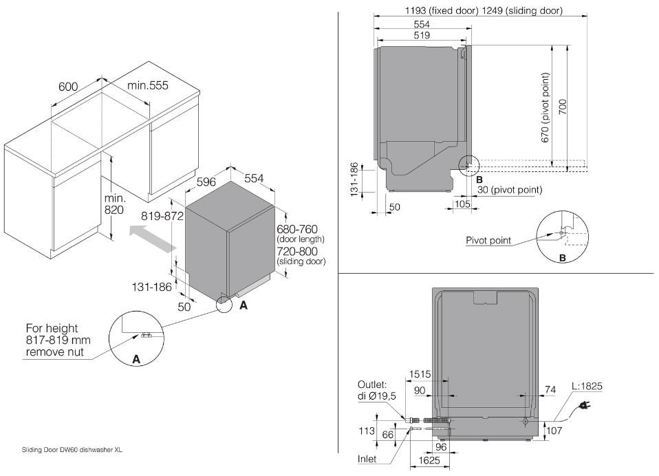 Asko DSD544D - схема встраивания с размерами к посудомоечной машине на разных языках на Hausdorf