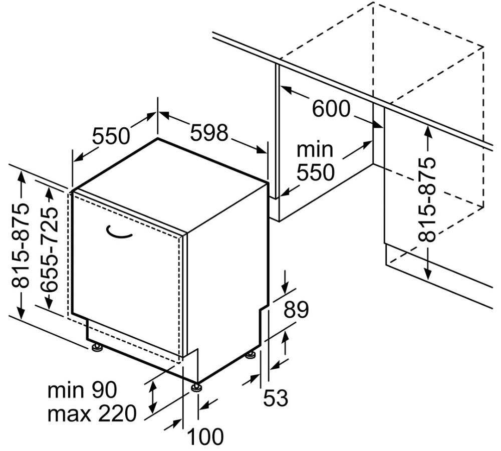 Bosch SMV 6 ZCX55E - схема встраивания с размерами на разных языках