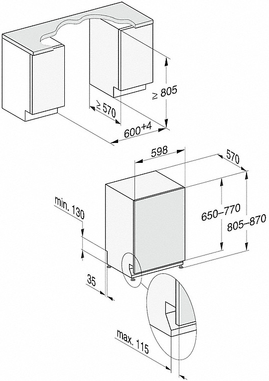 Miele G5050 SCVi - схема встраивания с размерами к посудомоечной машине на разных языках на Hausdorf