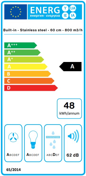 Falmec VIRGOLA NO-DROP TOUCH 60 - энергетический лейбл к вытяжке на разных языках на Hausdorf