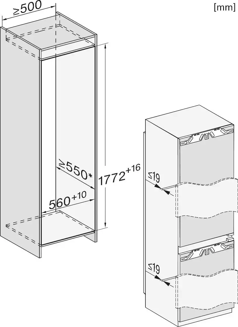 Miele KFN 7744 C - схема встраивания с размерами к холодильнику на разных языках на Hausdorf