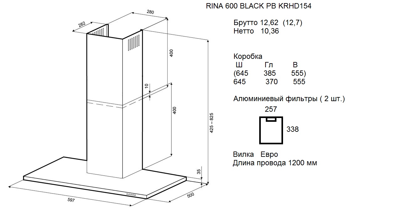 KRONA RINA 600 black PB - схема с размерами версия 2 к вытяжке на разных языках на Hausdorf