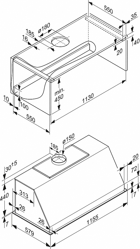 Miele DAR1155 - схема встраивания с размерами к вытяжке на разных языках на Hausdorf