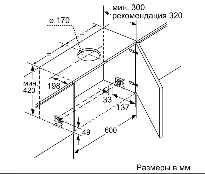 Neff D46ED52X1 - схема встраивания с размерами к вытяжке на разных языках на Hausdorf